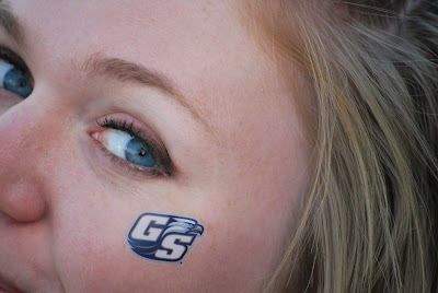 I have probably watched more football this fall than I have in my lifetime. And by watch football, you know I mean try to watch the "football" and not get distracted by the people. The Aggies have a winning team this year so that's grabbed all of our attention. The Houston Texans are also doing great...so I may have screamed "go, GO, GOOOO!" from my living room a time or two...while watching the game with Chuck. But this game at Statesboro, Georgia, on a gorgeous Saturday afternoon, surrounded by our good friends, the traditions of the pre-game, the game and the tailgating afterwards was the real deal. I can see why people get caught up in the whole thing. Down to wearing the colors of the team. And maybe even a fake tattoo on their cheek.